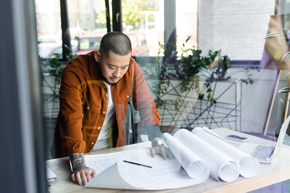 An architect designs the building layout, provides drawings, and advises on materials and compliance. Their work is translated into construction drawings (sometimes referred to as blueprints), which are the detailed drawings builders follow on site.