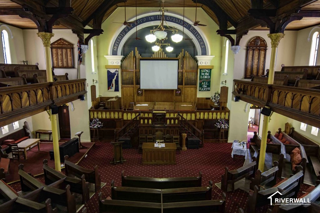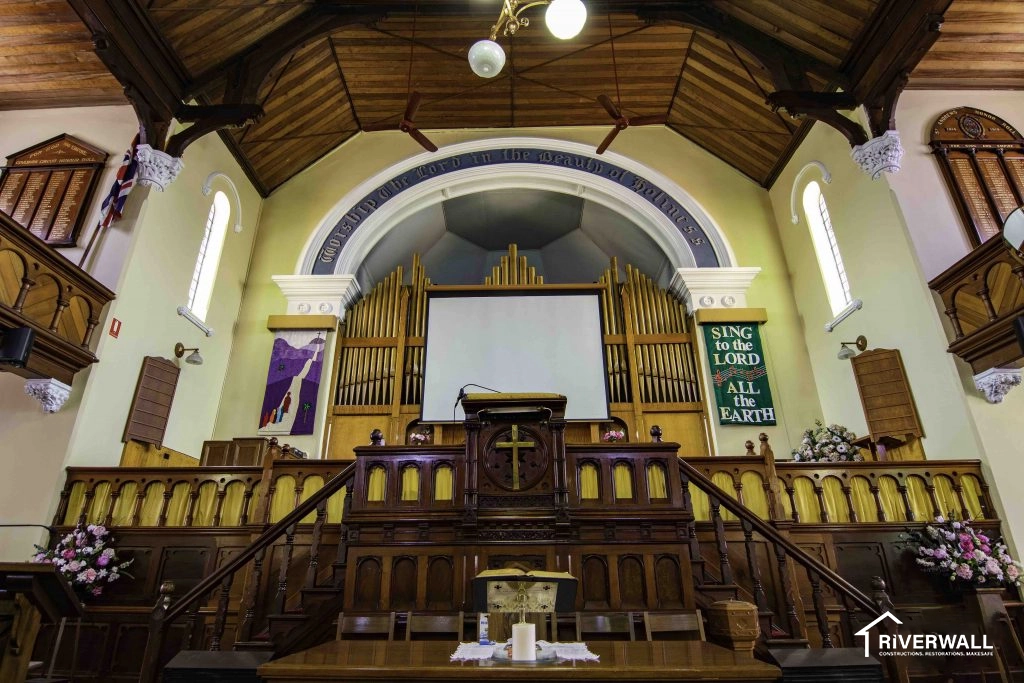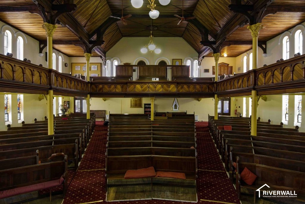 Riverwall Constructions were requested to quote on resultant water damage to a Church in Goulburn NSW. Reinstatement works included the replacement of the church carpet flooring, underlying MDF flooring, the sanding and staining to the entire exposed timber roof framework and to paint all walls to best match the existing condition prior to the water ingress event.